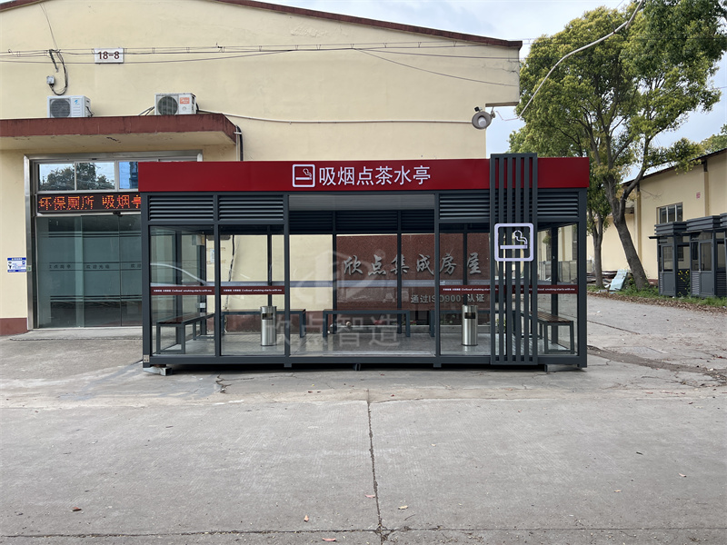 鋼化玻璃吸煙亭:光線明亮,安裝方便,工廠組裝好成品整體運輸吊裝到位,堅固耐用,使用壽命至少十年,重型鋼結構,抗臺風。頂部使用鋁板防水隔熱材料,保證下雨不漏水,隔音效果優良。并且內置電路,只要通電就可以在亭內使用電力設施,室內配置休息椅和煙灰桶,方便的功能,時尚的外觀,實在是廣大禁煙場所的不二之選!