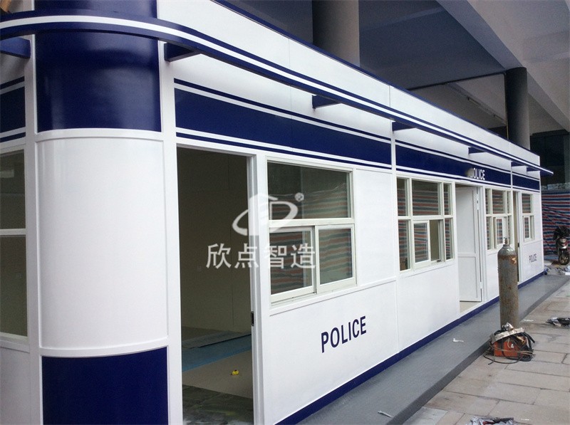 常用的警用治安崗亭尺寸有(寬*長*高):2m*2m*2.9m、2m*3m*3m、2*4*3m。2.5m*3m、2.5*3~5m*3m、2.5*5~8m*3m